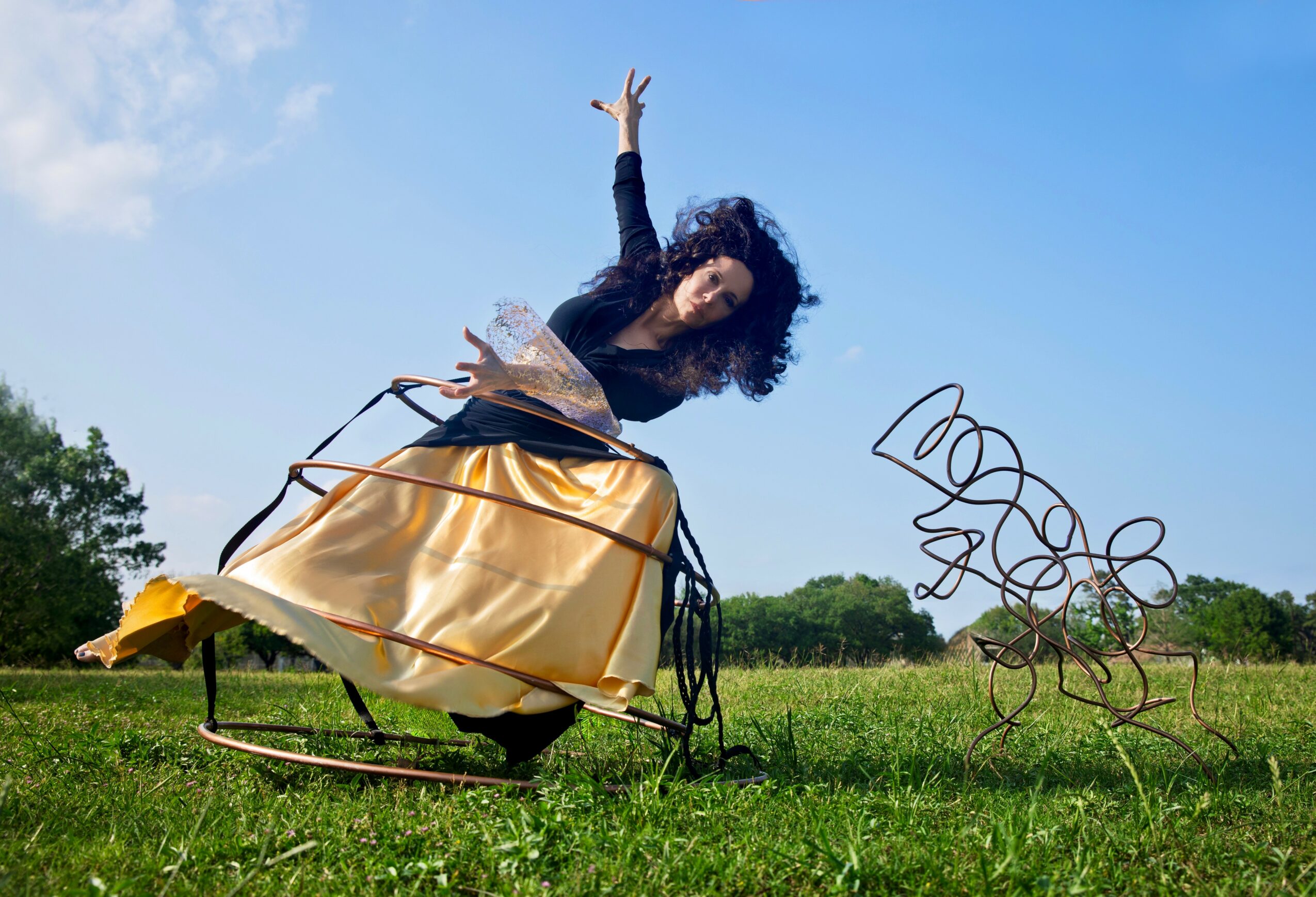 Photo of Singer-Composer Misha Penton (in hoop skirt outside with sculpture)