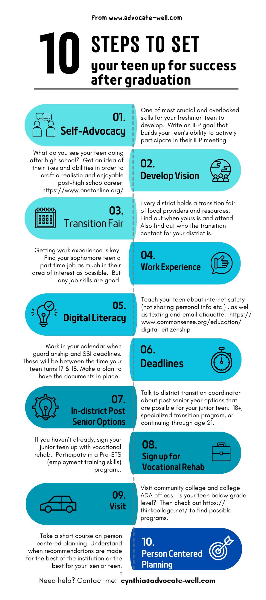 I’m also going to be focusing on helping parents create effective transition plans for their high school teens. When students graduate from high school, they often fall off the cliff of support that school provided. Parents are overwhelmed with choices about housing, how to help their young adults learn to live in a dorm or apartment independently, choices in different educational paths after high school, how to create a meaningful career path, applying for adult programs like SSI, transitioning their teen to the adult medical world, and creating a social network beyond high school.
