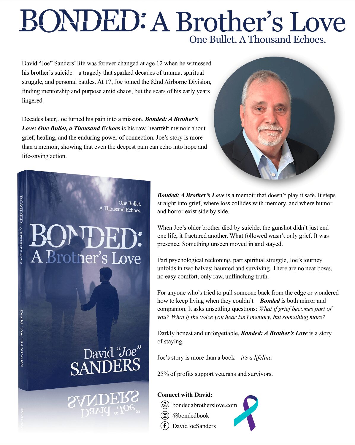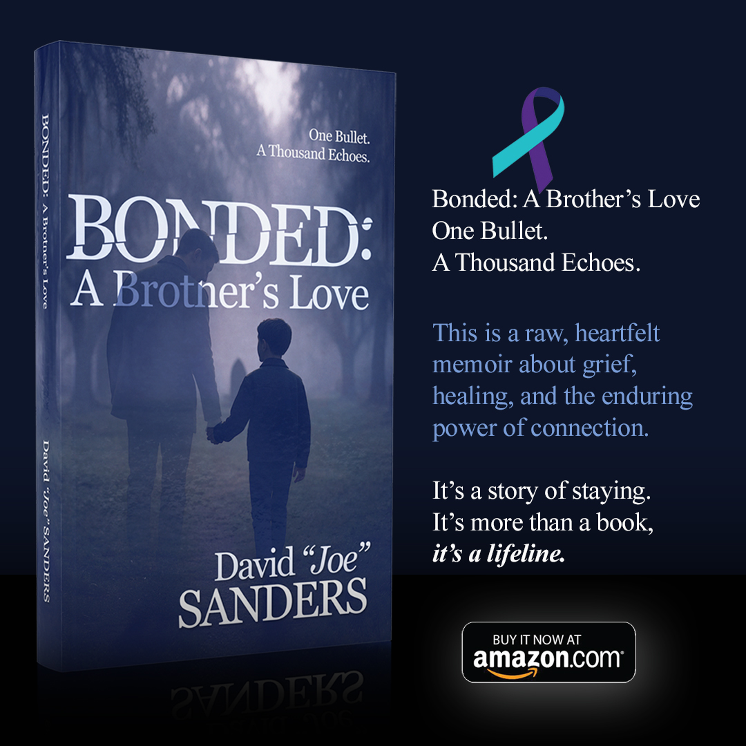 The day I told my son James that I was going to publish it, he told me that a good friend had just committed suicide that week, and the day I told my sister that I was going to publish it she had a co-worker kill themself. That co-worker was a follow up from the co-worker’s daughter killing herself two years earlier. I made my mind up at the end of that call that I was going to retire and spend the rest of my life as an advocate for suicide awareness and prevention in every way possible. To start with I went through with publishing the book and while it is selling on Amazon (Bonded A Brother’s Love; One Bullet. A Thousand Echoes), I am also giving away almost as many copies to people that need help or are in a position of leadership to get it into the hands of people that need help.