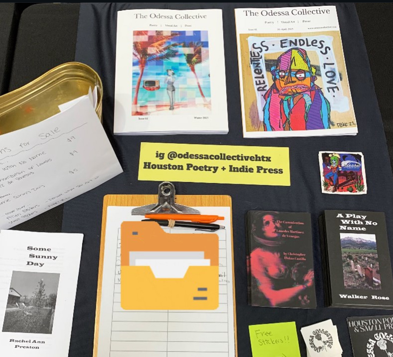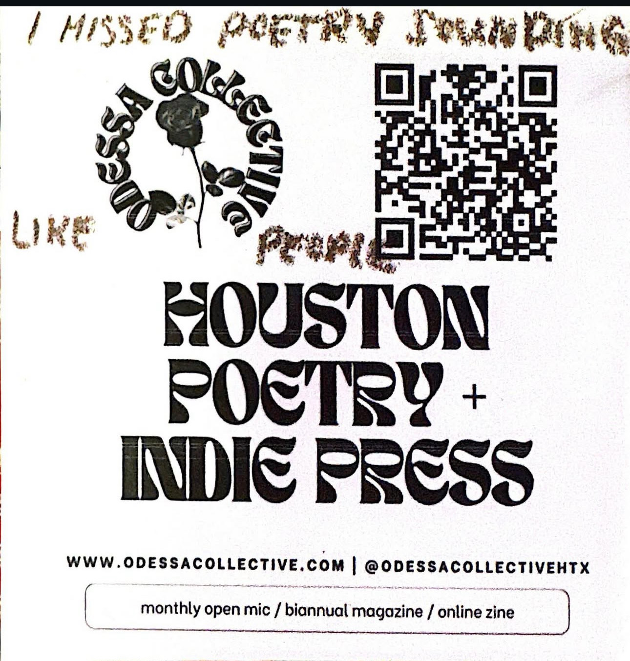 Hello! We started Odessa Collective as a small open mic for poetry and creative writing in 2021. This was when everything was barely opening back up and we were desperate for a place to share our reading and connect with other people again. As safely as we could, we started “The Disconnection Hotline”, which has become the name for our monthly open mic and reading series for the last 4 and a half years. Throughout the years, we have grown. Slowly we have added members, some have left. But the promise remains that we are always a community FOR the community – a place where those who aren’t necessarily involved with the UH writing community, which dominates most of the writing organizations in town, can be welcomed in with open arms. Regardless of class or degree, we want to be there to provide help, instruction, publishing opportunities and anything writing-related to anyone with an interest. No degree required.
