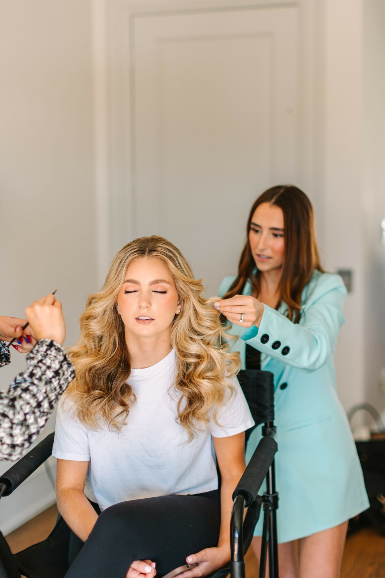 From there I did my sister’s hair and makeup as much as I could. I had always wanted to be a “teacher or hair dresser” growing up, and when it was time to go to college I decided to go to SHSU and study math in hopes to becoming a High School Math Teacher. During my year at Sam Houston I had joined a sorority where I was doing everyones hair for all of the date events. I charged $10 / services because It would take me about an hour to do one hair style, and that was more than my minimum wage job I had at the time. One of the sorority sisters in my chair said ” you should charge more this this, you are really good.” In that moment I thought to my self, you know, I actually am pretty good at this with zero training.. As that soaked in, I decided it might be something I should truly consider as a career. After a lot of thought, and guidance from my family and friends, I decided to stop attending university and go to cosmetology school. I finished the program in 9 months and 10 days (which at the time was SUPER quick). I learned there, that cutting, coloring, and perms were not my cup of tea. I liked that when styling hair someone could ask for a tweak if they wanted and I didn’t have to say “we can do that for you in 6 weeks, or once your hair is a little stronger/healthier again after this application”. Also, I had started doing bridal hair and makeup while I was in school for a local hair and makeup team. I wasn’t super booked- I was a new artist, so totally understandable, but I was eager for more work and experience. From there I went and “shot my shot” and applied in person at one of, or possibly, the TOP bridal hair and makeup companies in Houston at the time. They had done my prom and senior portrait hair and makeup, and made me feel fabulous, but also I still felt like me. They were also super inspiring to me during my time at Sam Houston and Cosmo school. They did end up hiring me, YAY! I was over the moon. I was trained by their lead hair stylist at the time, who now owns her own company as well where she educates bridal hair stylists – The Lovely Hair Class. After almost 7 years with the team I gained experience and confidence in my artistry, and finally longed for something of my own. I had mentioned always wanting to be a teacher as well, so I decided to open Stylist and Co. A company where we do event hair and makeup, but also teach self application hair and makeup classes, AND I do dabble in some fashion styling as well. I have now owned my company for right around a year, and it has been incredibly rewarding.