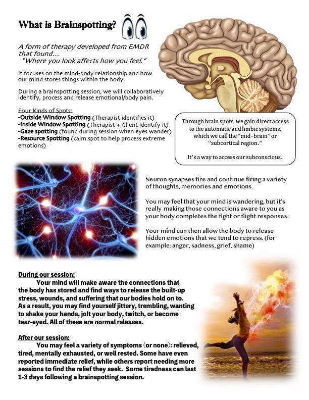 I also utilize a powerful yet gentle technique known as Brainspotting. As a certified Brainspotting therapist, I have witnessed profound healing as clients access deeper mind–body processing and experience meaningful somatic release when exploring anxiety, depression, grief and past trauma.