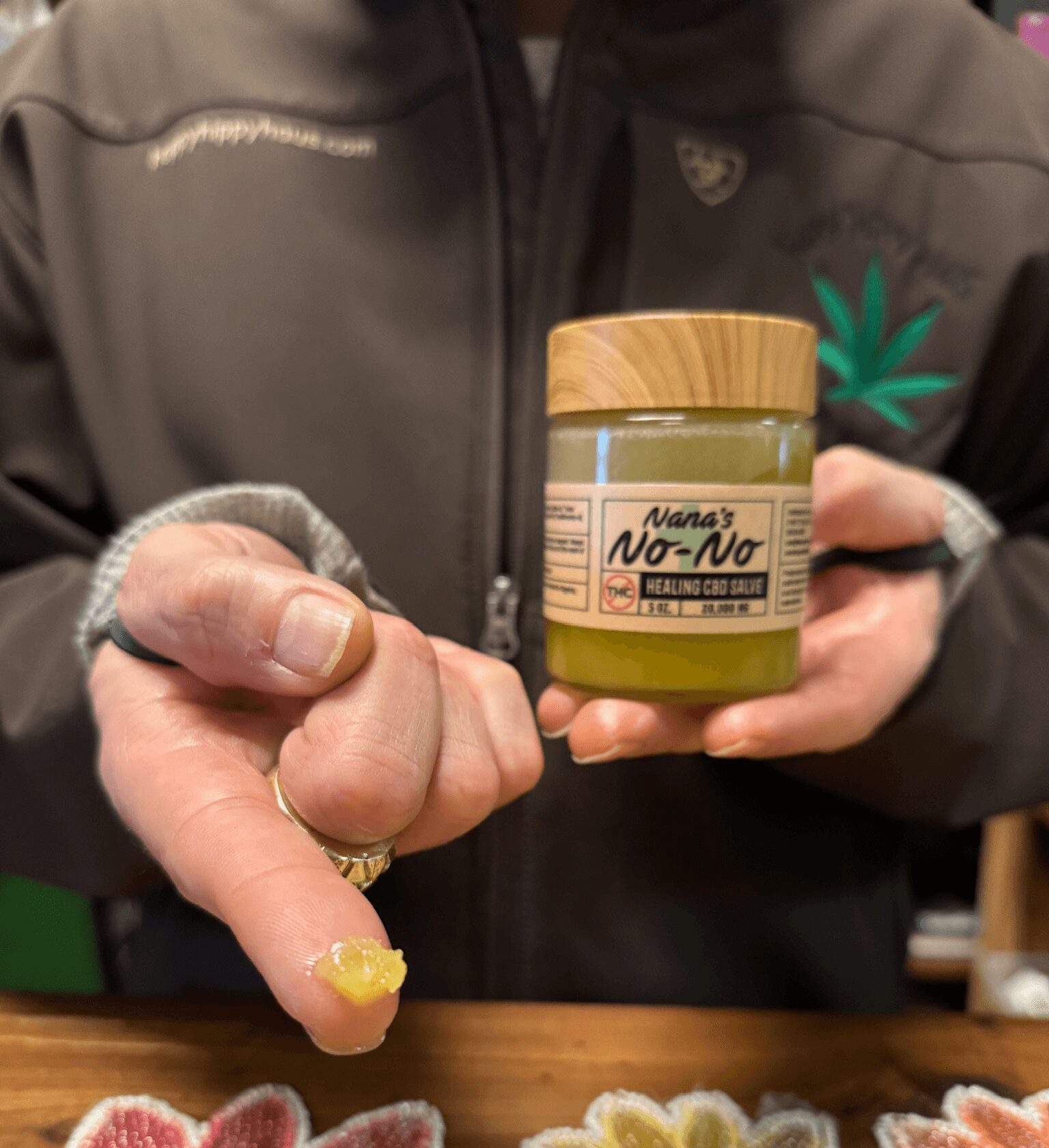 Our most loved product is the Nana’s No-No Healing CBD Salve, a handcrafted balm based on my Yaya’s original recipe that I’ve refined and made my own over the years. It has become a local favorite because it works, plain and simple. I’ve had guests tell me they use it for everything from burn recovery and post-surgery healing to joint pain, arthritis, and even symptoms related to MS. The stories people share about how this balm has improved their quality of life remind me daily why I started this journey.