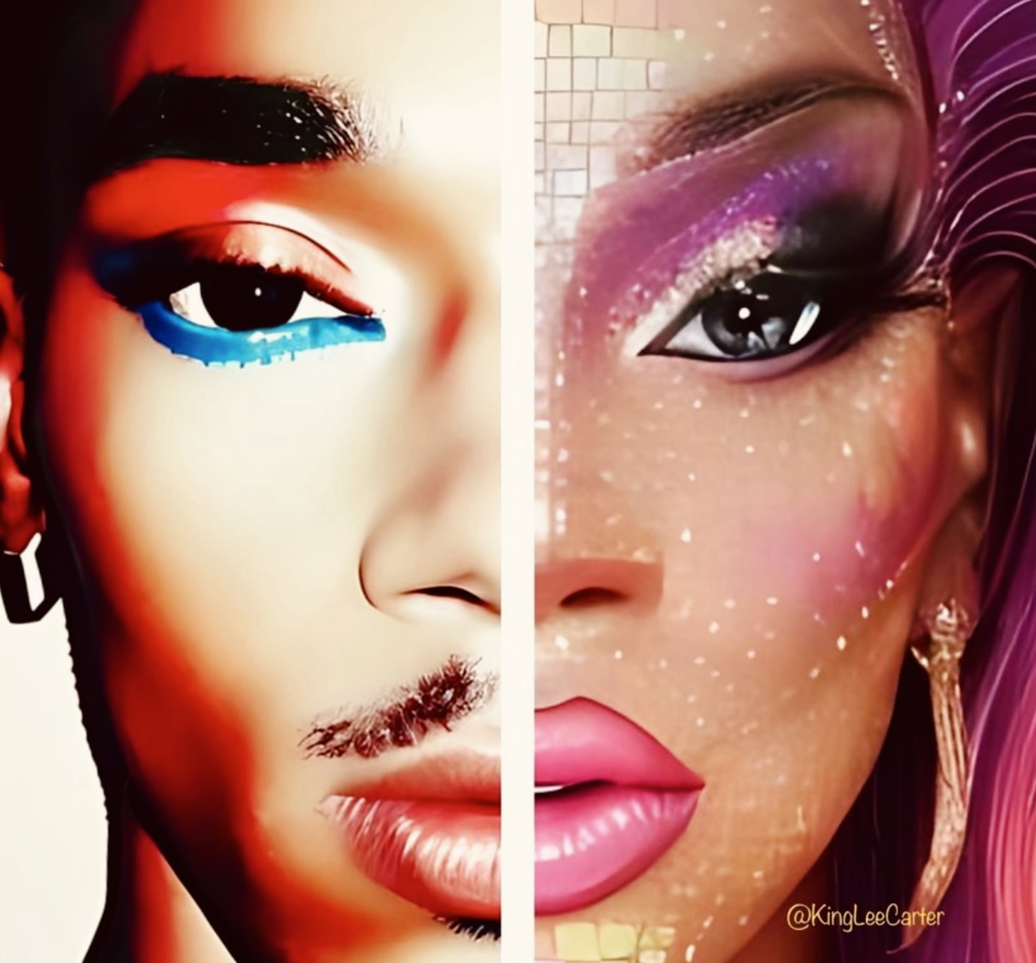 In 2009, while working a construction job I discovered Houston’s Montrose scene. This is where I started experimenting with applying makeup to myself and others. There weren’t many references or tutorials online for men in makeup so it was DIY and I gained skills along the way. I wasn’t a member of a house and more drag adjacent so the queens gave me space to do my own thing. Drag can be many things for different people. At first my style was androgynous and then evolved toward drag art. I gogo danced and did a few competitions before producing content online in 2011. I’m known for creating various illusions but it was doing Beyonce impersonations that got me noticed.