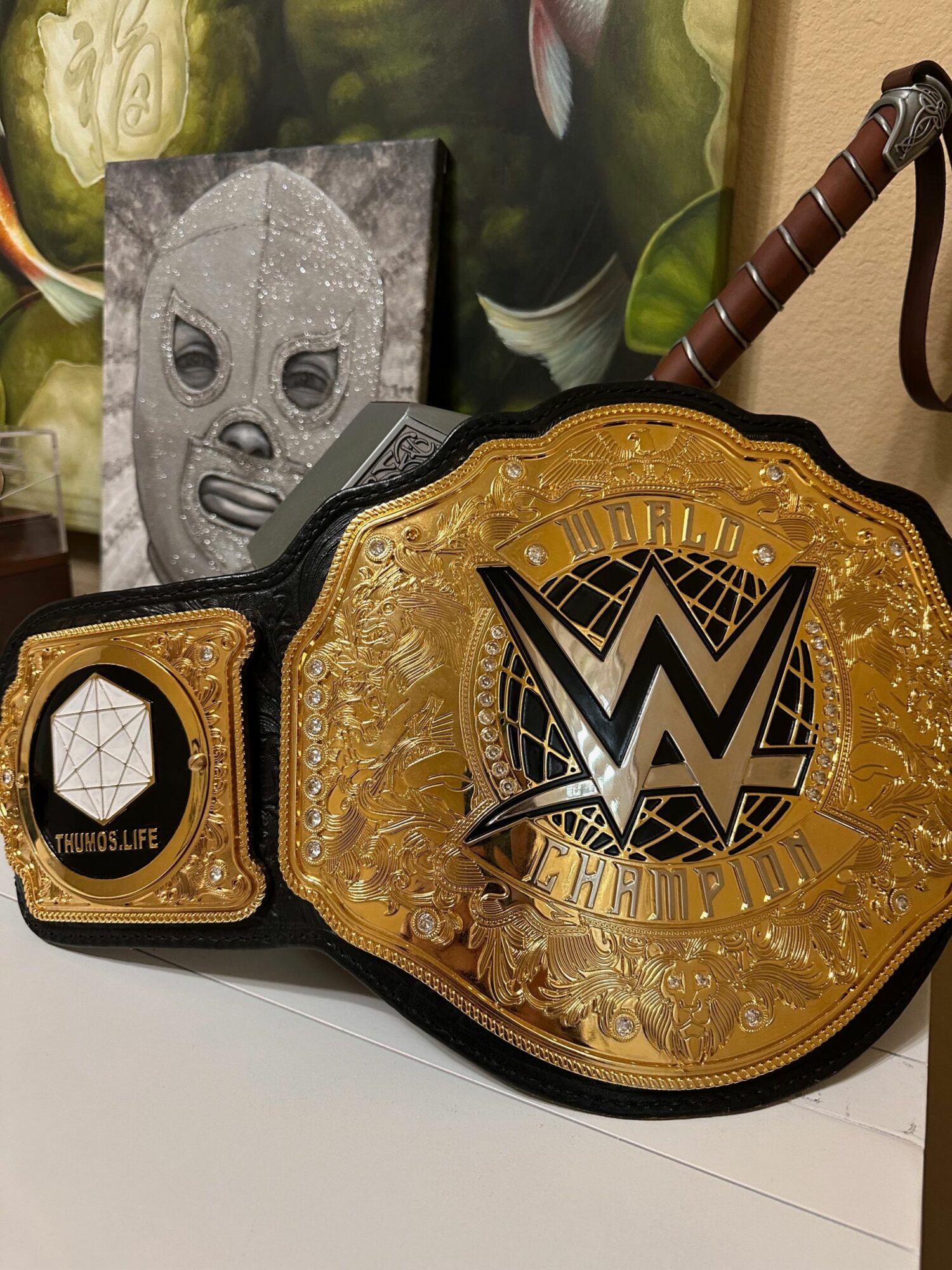 1. Some of my non-traditional therapy tools of the trade (My MCU movie accurate Mjolnir metal hammer, gorgeous painting of the legendary luchador Santo, and my custom made Professional Wrestling metal Championship Title belt, complete with custom side plates that have my private practice logo)