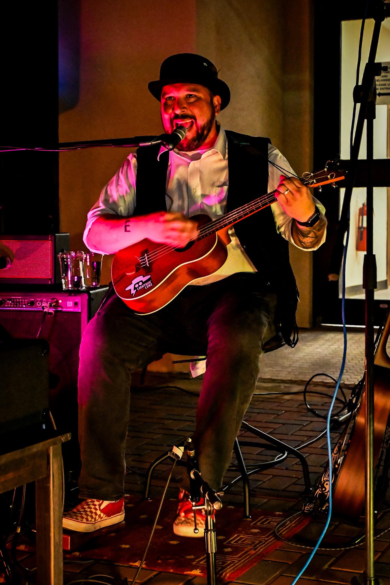 My stage name is Vtephen (Stephen with a V). It is a joke because that is what I say every time people have to write my name. Steven with V. I am a one-man band in that I play guitar while using a bass drum foot pedal on a suitcase and a foot tambourine. I saw this being done by buskers out in New Orleans and the bluegrass/folk punk bands coming out of the Pacific Northwest. Several others in the area will play a cajon or tambourine while they strum the guitar, but I try to do it faster and louder. I want people to feel the energy while I play and laugh with me at the lyrics about daily struggles.