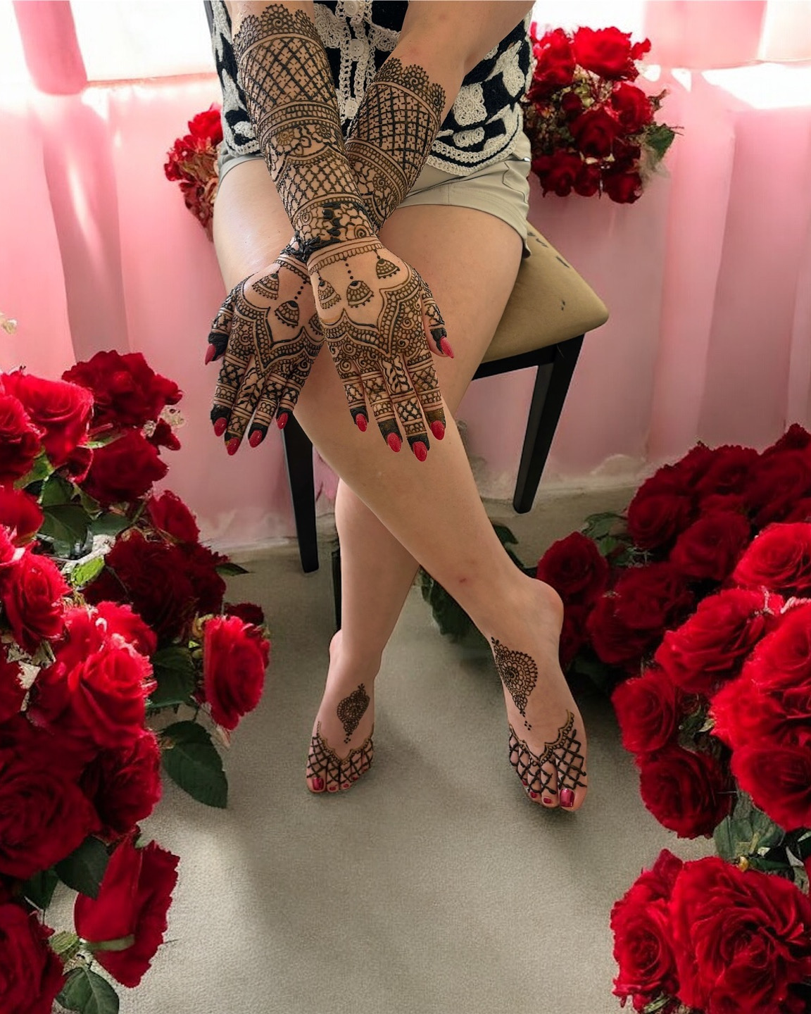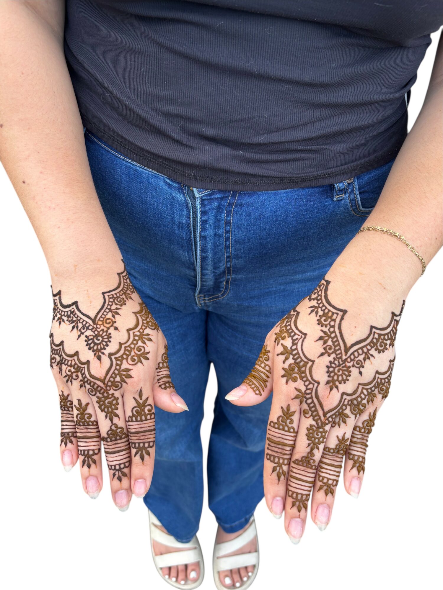 What sets me apart is my speed, precision, and creativity. Whether it’s a large group event or a personal bridal session, I can create unique, detailed designs quickly without sacrificing quality. I also take pride in my versatility—beyond traditional henna on hands and feet, I create henna art on: