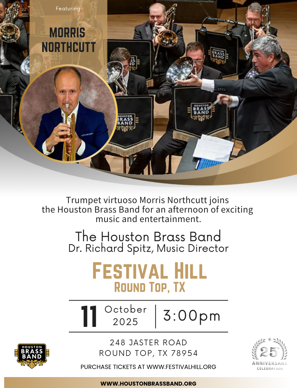 The band will also perform in March, in Dallas, as a part of Texas Brass Fest. There is a 25th Anniversary Concert in April at St. Thomas Episcopal Church in Houston. HBB has commissioned a new composition for the occasion from composer Dr. William Brusick. The winner of the 2025 student solo competition will also be featured.