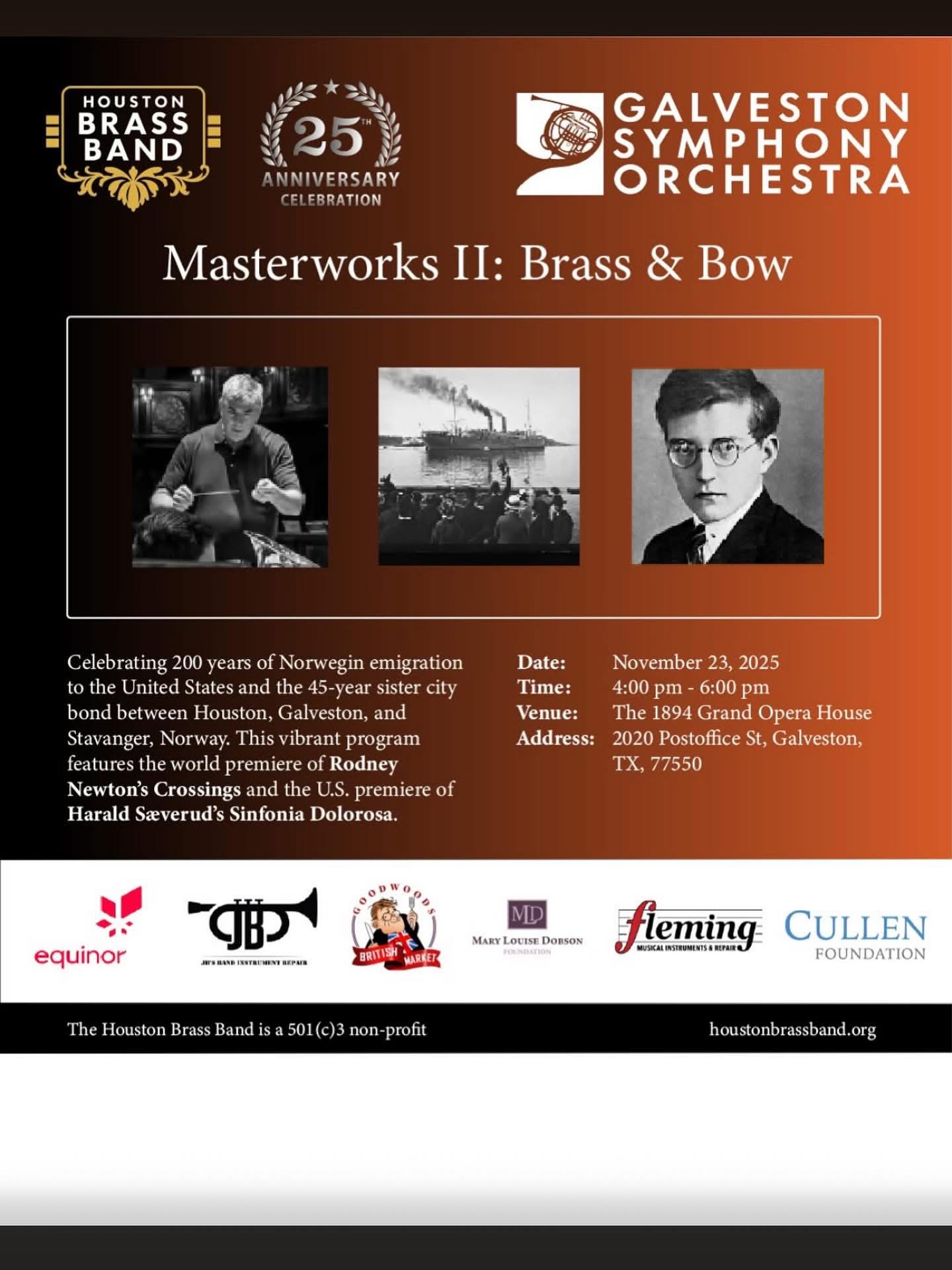 Houston and Galveston have strong ties with Norway as they enjoy Sister City status with the city of Stavanger. The “Crossings Celebration Concert,” will be presented in Galveston at the Grand 1894 Opera House in conjunction with the Galveston Symphony Orchestra on Sunday, November 23, 2025 at 4 pm. This concert has been registered with the Norwegian American Historical Society. The GSO will perform works written by one of the most famous composers of Norway, Harald Saeverud. The conductor of the GSO, Trond Saeverud is a direct descent. The ensembles will also perform together on 2 selections, Entry of the Byars march by Norwegian composer Johan Halvorsen and Shostakovich Festive Overture.
